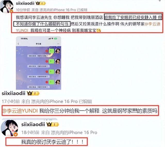 要说司晓迪早前就有“碰瓷”明星的操作。 早前指责秦霄贤出轨,后控诉李汶翰对其进行精神控制,还曾提及李云迪对她有酒后不轨行为。