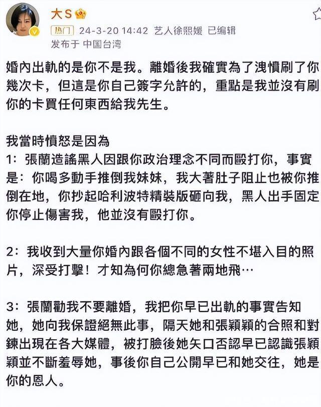 这也让我们看到,他虽从前行事高调、脾气急躁,甚至有些莽撞“发疯”,但对前妻,心底里始终藏着一份割舍不掉的情分。 每逢过节团圆的时刻,他便总会情绪上头、再度“发疯”,在社交平台发文,字里行间透露着对前妻大S的想念!