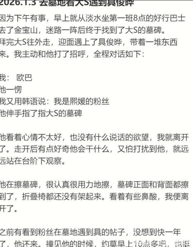 两种“深情” 新年这几天,有大S的粉丝前往墓园悼念偶像,竟恰巧偶遇了具俊晔。 他独自一人前来,手里提着不少东西,身形清瘦得惹人心疼,整个人状态很不好,眉宇间满是化不开的落寞。