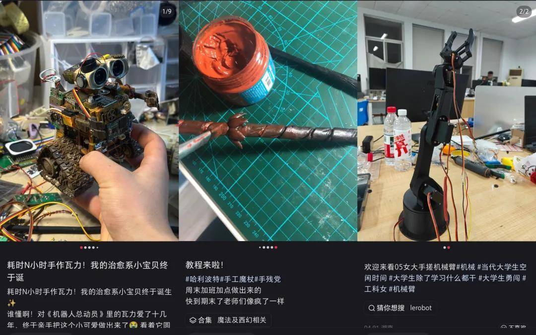 短视频平台上,“手搓博主”越来越多。有人在家自制《机器人总动员》里的机器人瓦力,让它上街买菜;有人手搓了一根能控制智能家居的哈利波特魔杖,火到了海外;有人租地下车库做实验室,在里面直播手搓机器人,吸引了上千名机器人爱好者来围观学习。