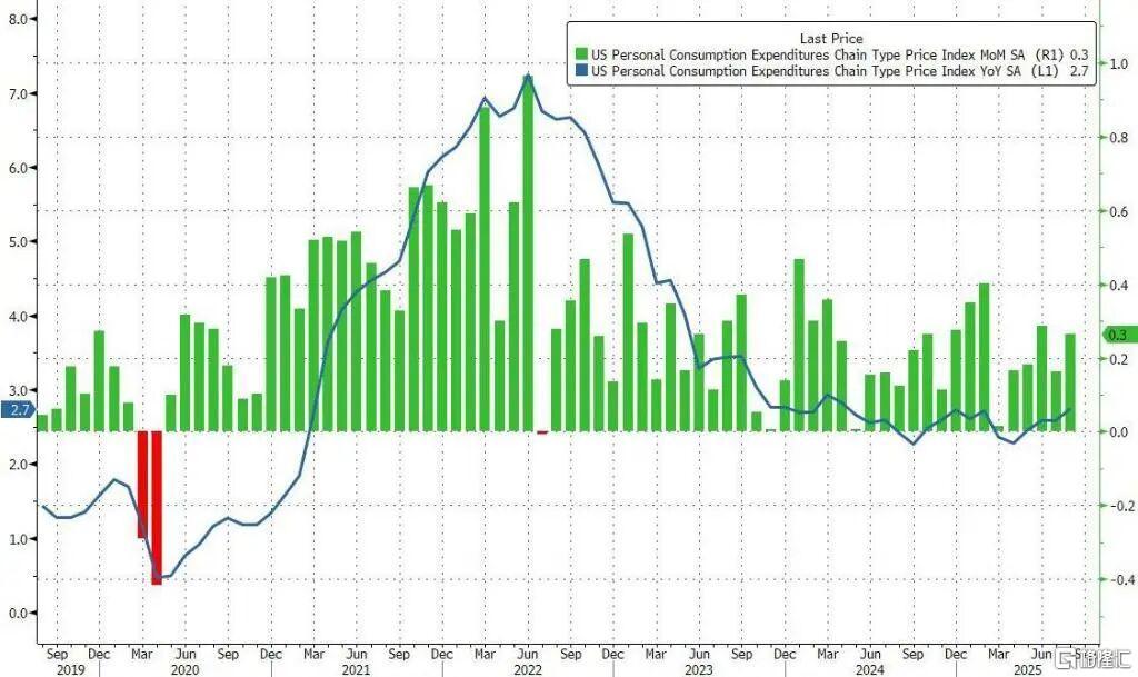 美国8月个人消费支出(PCE)环比上涨0.3%,年化整体通胀率为2.7%。