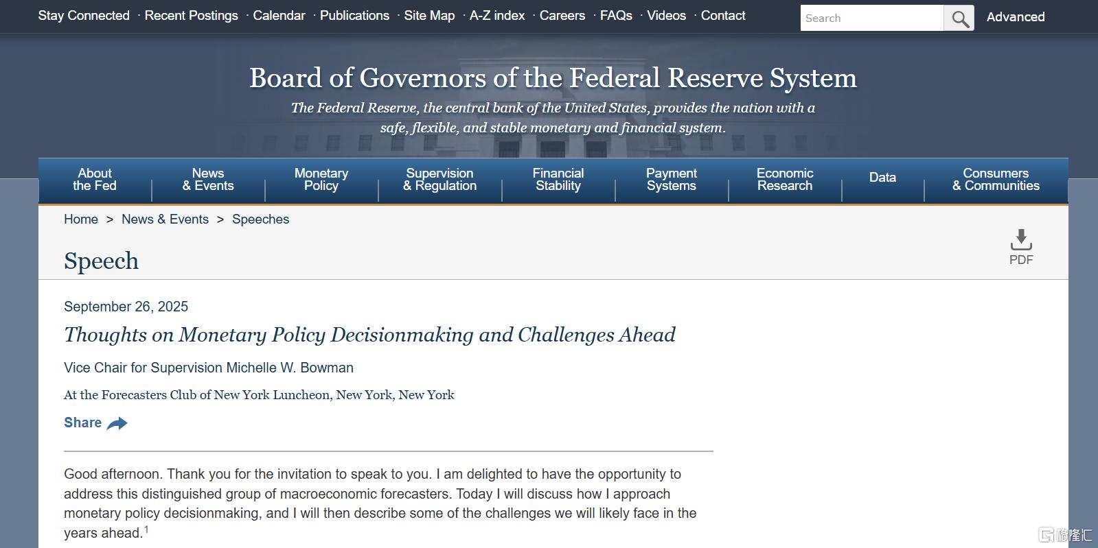 当地时间9月26日,美联储负责监管事务的副主席米歇尔·鲍曼发表了题为《对货币政策决策的思考和未来的挑战》的演讲。